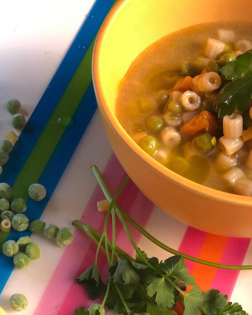 Add the peas, the pasta and leave to cook until "al dente" (both will continue to cook for a while into the hot broth)